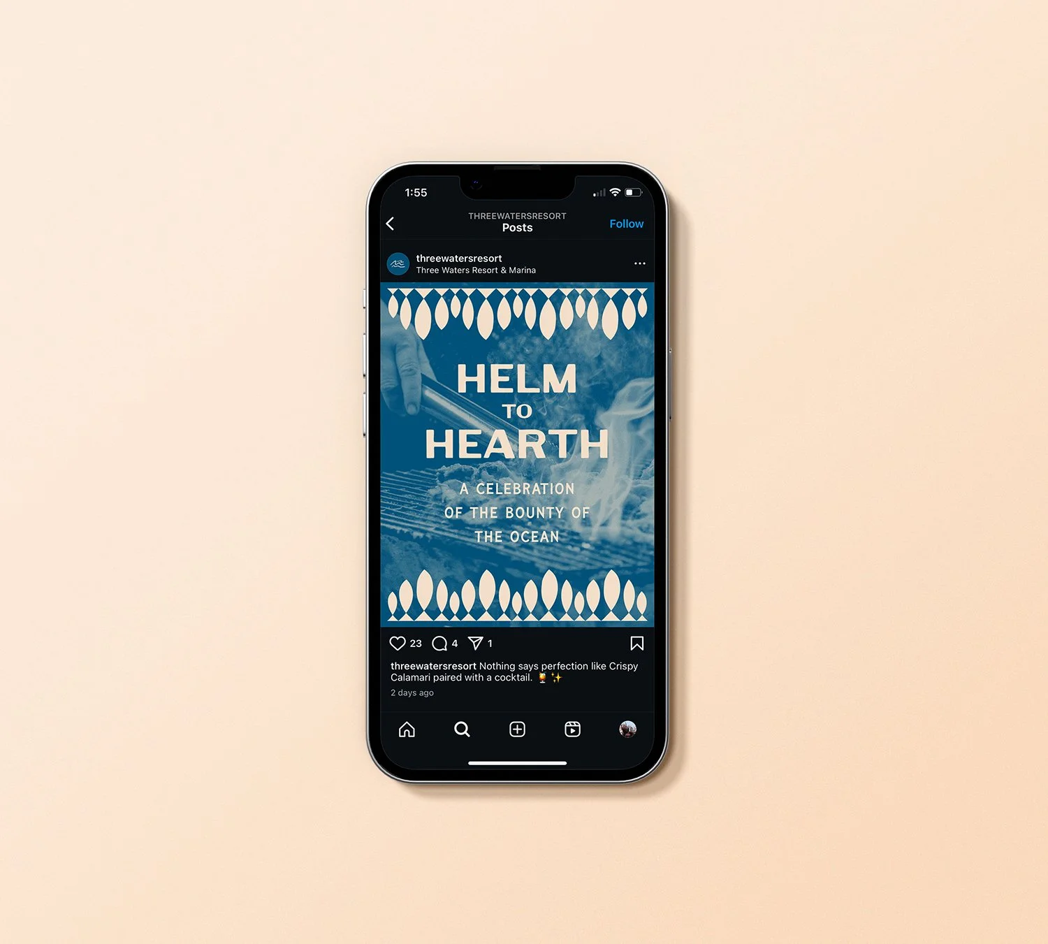 A Celebration Of The Ocean’s Bounty – Helm to Hearth is an annual event that takes place at the newly renovated Three Waters Resort and Marina in Islamorada Florida. The spring weekend event combines deep sea fishing adventures with a culinary focus back on land featuring visiting top chefs who create tasting menu’s around the local harvest. We worked with Three Waters Resort & Marina and their hospitality team to design a brand identity that captures the spirit of the open ocean and culinary flair. The brand was applied to digital promotional materials as well as physical swag and printed pieces given out during the event.